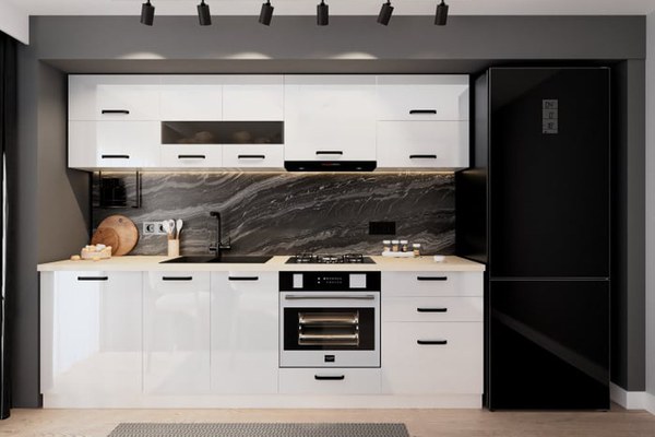 CARACTERISTICI GENERALE: Material: Corp: Pal melaminat Alb Front: MDF Alb lucios Dimensiuni Bucatarie : Lungime 260 x Adancime 60 x Inaltime 200cm Dimensiuni Blat : (x1buc) 260x 60 cm Mai multe detalii: Glisiere cu bila Manere...