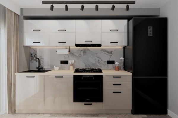 Set de mobilier pentru bucătărie, realizat din PAL melaminat și MDF lucios acril, cu design modern și configurație modulară, conceput pentru flexibilitate în montaj și utilizare eficientă a spațiului. Dimensiuni Caracteristică Dimensiune...