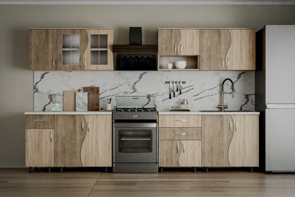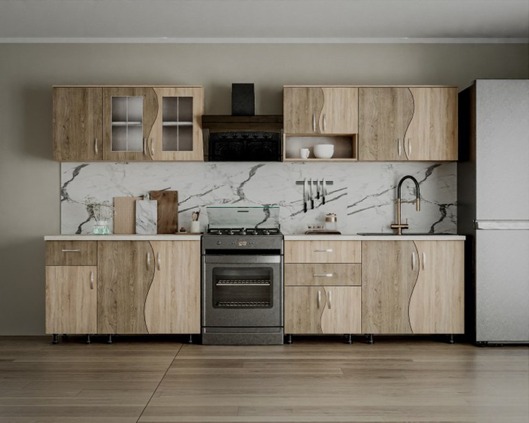 Material: Corp: Pal Melaminat Sonoma Front: Pal Melaminat Sonoma+Trufe Dimensiune Bucatarie: Lungime 260 x Adancime 60 x Inaltime 200cm Dimensiuni corpuri: ( Lungime x Adancime x Inaltime ) Corp Inferior de 80cm ( x 1 buc. ) : 80 x 47 x 83cm...