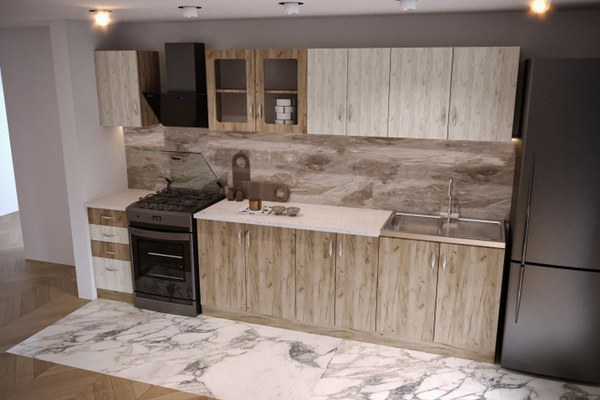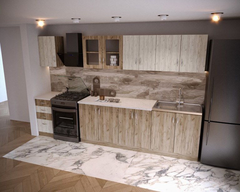 Material: Corp: Pal Melaminat Front: Pal Melaminat Dimensiune Bucatarie: Lungime 260 x Adancime 60 x Inaltime 200cm Dimensiuni corpuri: ( Lungime x Adancime x Inaltime ) Corp Inferior 60 ( x 1buc. ) : 60x47x83cm Masca Chiuveta ( x 1buc....