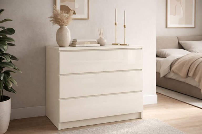 Comodă pentru dormitor, realizată din PAL melaminat și MDF, cu design modern și format compact, ideală pentru spații mai mici. Nuanțe Componentă Specificație Corp PAL melaminat Alb Front MDF Alb Lucios Dimensiuni Caracteristică...