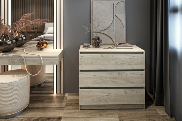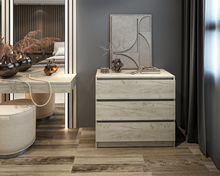Dimensiuni : Lungime 90 x Adancime 44 x Inaltime 80cm Nuante : Corp - Pal melaminat Stejar K003 Front - Pal melaminat Stejar K003 Caracteristici : Glisiere pe bile 3 sertare Poze reale! Produsul se livreaza in pachet, cu schita de montaj...