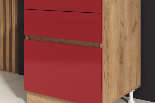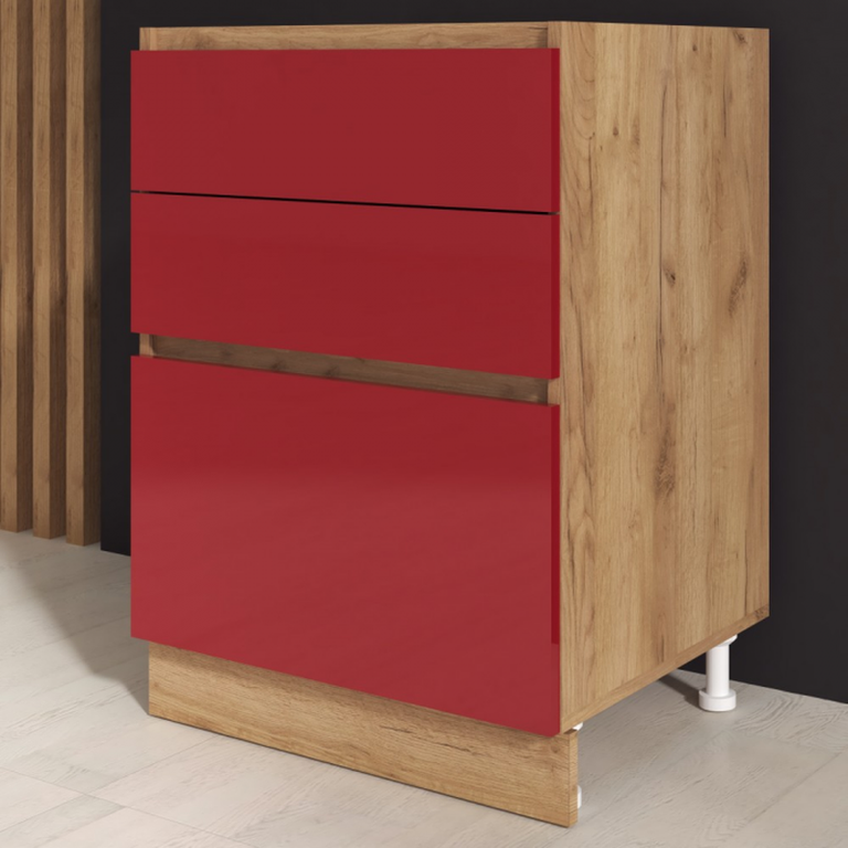 Dimensiuni: Lungime 60 x Adancime 49 x Inaltime 82cm Material : Corp : Pal melaminat - Stejar K003 Front : MDF - Rosu Caracteristici: 3 sertare Front din MDF acril Produsul se livreaza in pachet ( 1 colet ), cu schita de montaj si feroneria...