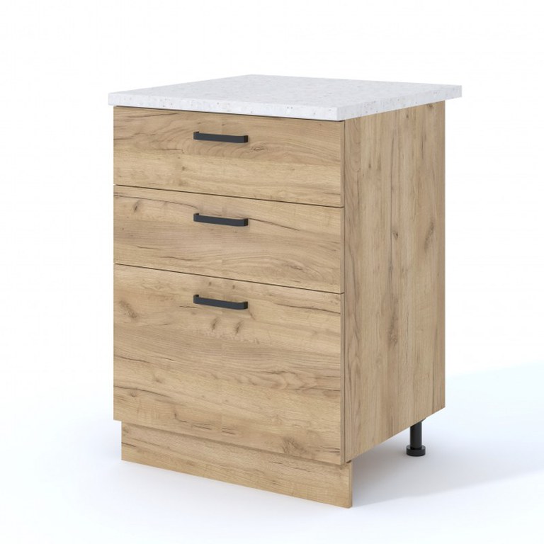 Dimensiuni: Lungime 60 x Adancime 60 x Inaltime 85cm Material: Corp : Pal melaminat Stejar K003 Front : Pal melaminat Stejar K003 Caracteristici: 3 Sertare Blat termorezistent Produsul se livreaza in pachet ( 1 colet ), cu schita de montaj...