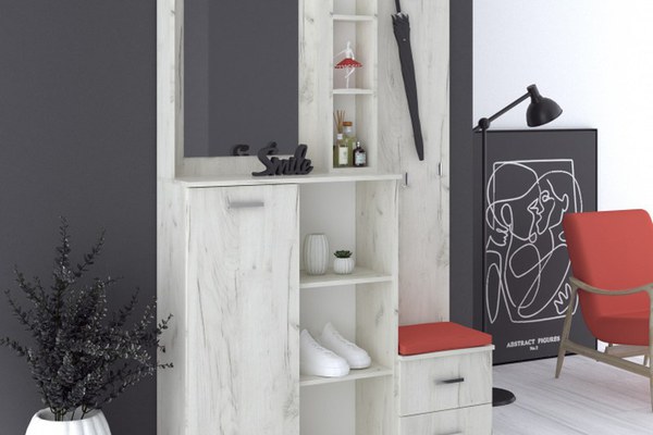 Dimensiuni : Lungime 120 x Adancime 34 x Inaltime 200 cm Material : Corp: Pal melaminat K001 Front: Pal melaminat K001 Caracteristici : 6 agatatori ( DUBLE ) Oglinda Polite 2 sertare Produsul se livreaza in pachete, cu schita de montaj...