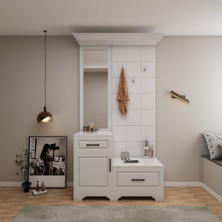 Dimensiuni : Lungime 113 (123 la coroana) x Adancime 43 x Inaltime 205 cm Material : Corp: Pal melaminat Alb Front: MDF infoliat Alb Caracteristici : 3 agatatori ( DUBLE ) Oglinda 1 Usa 2 Sertare Glisiere cu bila Produsul...
