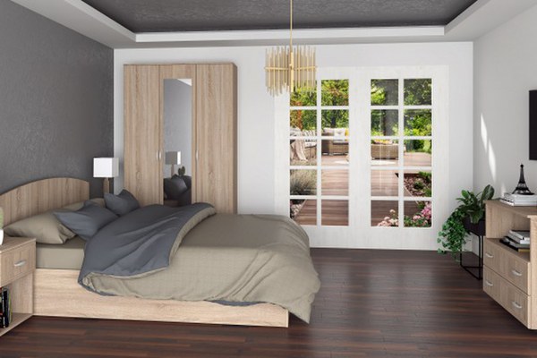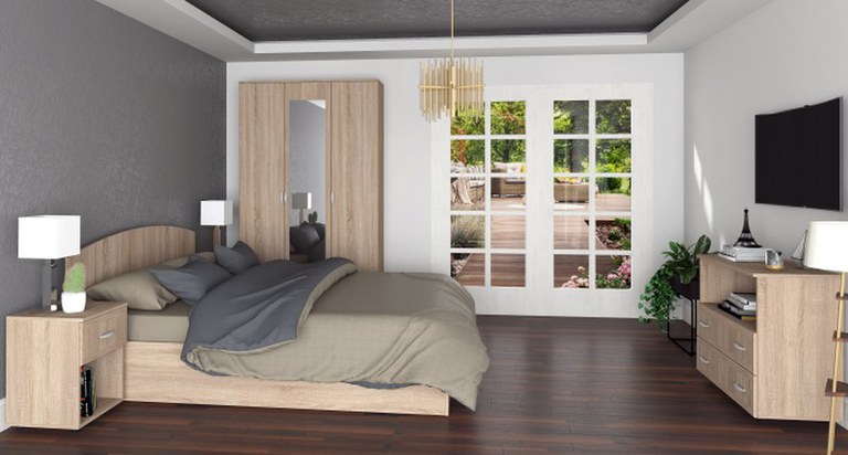 Material: Corp: PAL Melaminat Front: PAL Melaminat cu cant Soft Dimensiuni Corpuri: Dulap 3 Usi cu rafturi si bara haine ( x 1 buc ): Lungime 120 x Adancime 50 x Inaltime 200cm; Pat 2 persoane ( x 1 buc ): Lungime 165 x Adancime 204 x Inaltime...