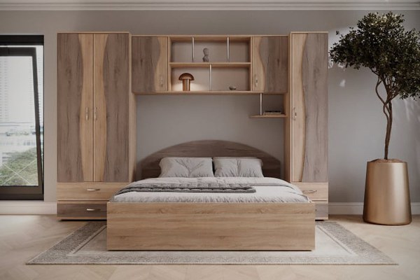 Material: Corp: PAL Melaminat Sonoma Front: PAL Melaminat Sonoma+Trufe Dimensiuni: Dulap cu 2 Usi ( bara de haine ): 77 x 51 x200cm Soldat cu rafturi: 40 x 51 x 200cm Vitrina: 147 x 32 x 63 82cm Pat: 145 x 205 x 32 80cm ( dimensiune saltea...