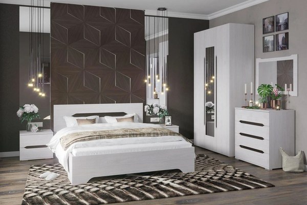 MATERIAL: Corp: Pal melaminat K001 Front: Pal melaminat K001 DIMENSIUNI CORPURI: Dulap 3 usi cu rafturi si bara de haine (x 1 buc): Lungime 120 cm x Adancime 50 cm x Inaltime 220 cm Pat 2 persoane (x 1 buc): Lungime 164 cm x Adancime 204 cm x Inaltime...