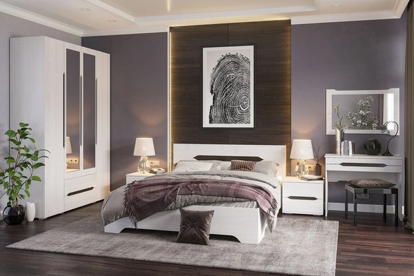 MATERIAL: Corp: Pal melaminat K001 Front: Pal melaminat K001 DIMENSIUNI CORPURI: Dulap 4 usi cu rafturi, sertare si bara de haine (x 1 buc): Lungime 160 cm x Adancime 50 cm x Inaltime 220 cm Pat 2 persoane (x 1 buc): Lungime 164 cm x Adancime...
