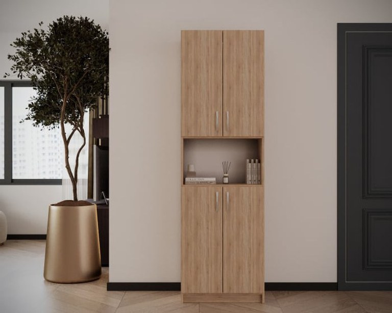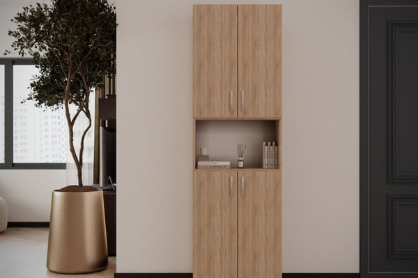 Dimensiuni: Lungime 60 x Adancime 37 x Inaltime 196cm Nuante: Pal melaminat Sonoma Caracteristici: Dulapul este prevazut cu 5 spatii pentru depozitare Produsul se livreaza in pachete , cu schita de montaj si feroneria necesara pentru asamblare...