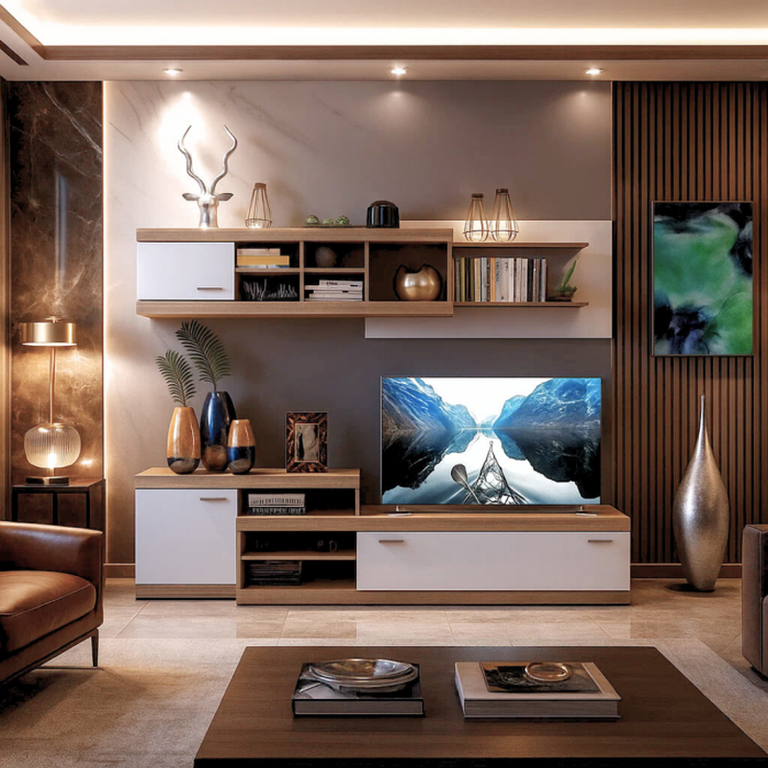 Material: Corp : Pal melaminat Sonoma Front : Pal melaminat Alb Dimensiuni: Lungime 253 x Adancime 42 x Inaltime 200cm Spatiu TV: Lungime 134 x Inaltime 100cm Produsul se livreaza in pachete, cu schita de montaj si feroneria necesara pentru...