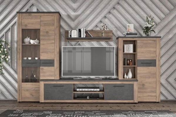 Material : Corp: Pal melaminat Stejar Craft Front: Pal melaminat Stejar Craft + Tobacco Matera Dimensiuni: Lungime 315 x Adancime 45 x Inaltime 200cm Vitrina Stanga: Lungime 90 x Adancime 34 x Inaltime 200cm Vitrina Dreapta: Lungime 90 x Adancime...