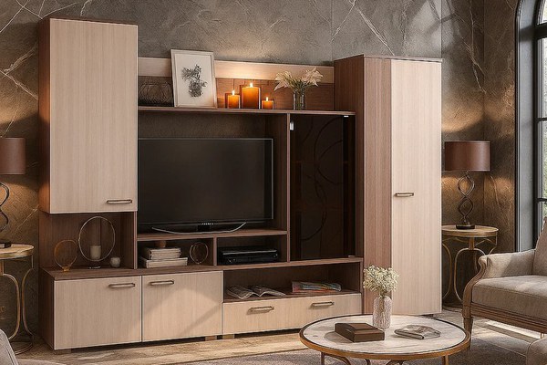 Material : Corp: Pal melaminat Frasin shimo inchis Front: Pal melaminat Frasin shimo deschis Dimensiuni: Lungime 260 x Adancime 41 x Inaltime 194cm Spatiu TV: 100 x 78 cm Caracteristici : Polite Bara haine Produsul se livreaza in pachete,...