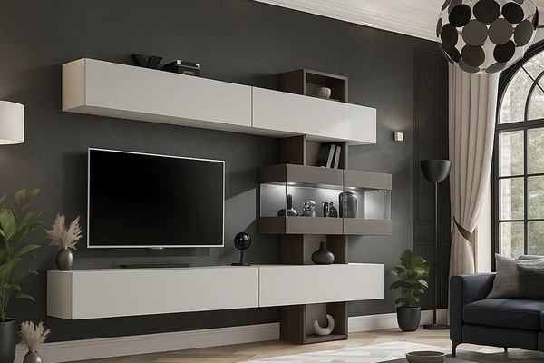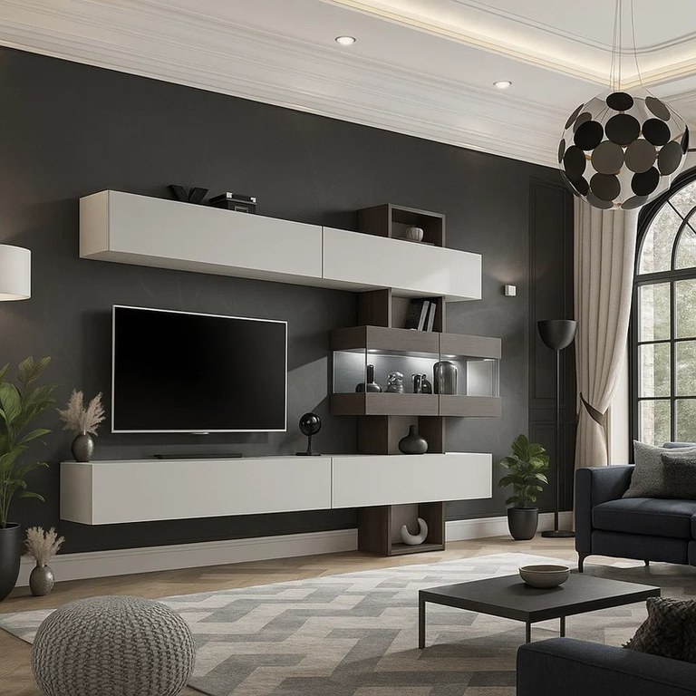 Material : Corp : Pal melaminat Alb lucios Front : MDF infoliat Alb + PAL Wenge mali Dimensiuni: Lungime 230 x Adancime 35 x Inaltime 180cm Spatiu TV : 140x106cm Caracteristici : Polite Produsul se livreaza in pachete, cu schita de montaj...