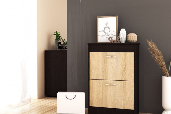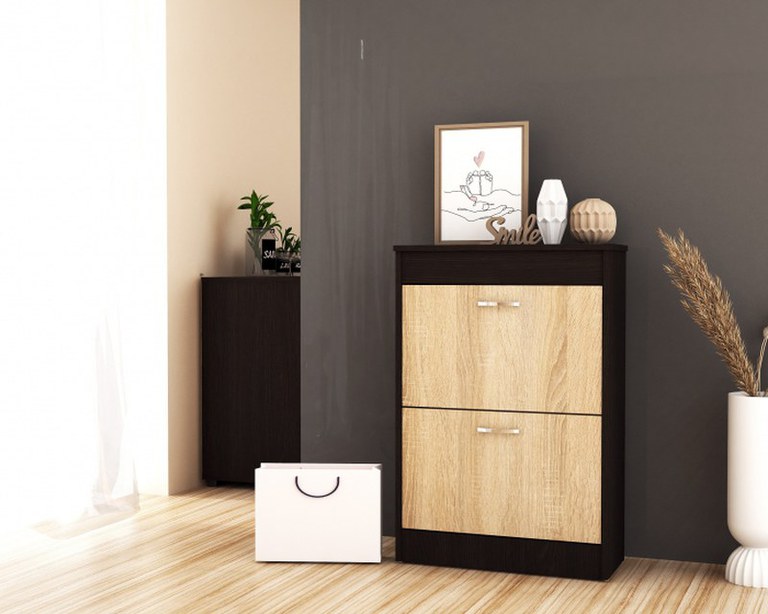 Material: Corp: Pal melaminat Wenge Front: Pal melaminat Sonoma Dimensiuni : Lungime 80 x Adancime 26 x Inaltime 98cm Caracteristici : 2 Usi rabatabile Sistem pentru pantofi Usile sunt din PAL. Produsul se livreaza in pachet, cu schita...