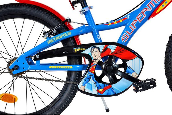 Bicicleta copii Dino Bikes Superman 20 inch, varsta 7-11 ani, inaltimea 120-145 cm, frana de mana pe roata fataspate, suport cu sticla de apa, cric, claxon pe ghidon, rotile sunt prevazute cu reflectoare, anvelope gonflabile