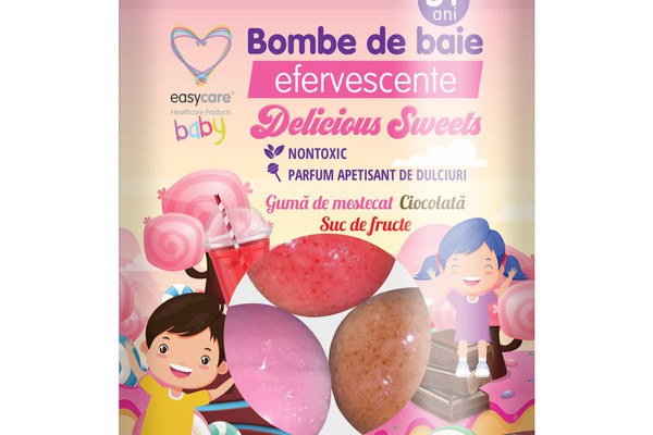 Bombe de baie efervescente pentru copii Delicious Sweets 3 buc EasyCareBombele de baie EASYCARE, sunt saruri de baie reconfortante in forma de bulina, ce pot fi utilizate in timpul baii.Aceste produse