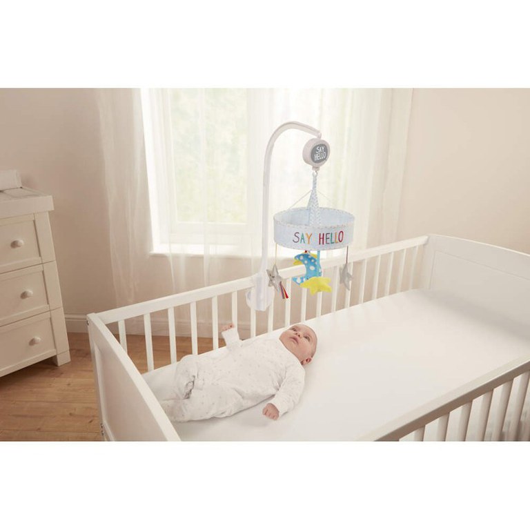 Este potrivit de la nastereMecanism manual cu cheita, cu buton de pornireoprire (onoff)Nu necesita bateriiRotirea delicata a plusurilor cu fete adormite ( stelute, luna, soare ), ce capteaza atentia b