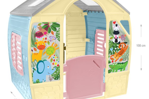 Casuta de gradina Happy House a fost creata de compania Mochtoys.Casuta masoara 108 centimetri inaltime, 102 centimetri lungime, 88 centimetri latime. Este destinat copiilor de la 12 luni.Casuta este
