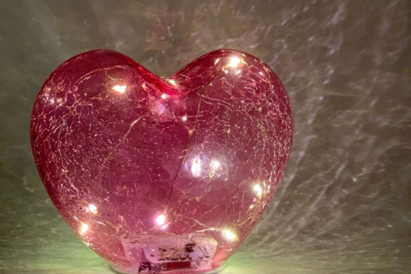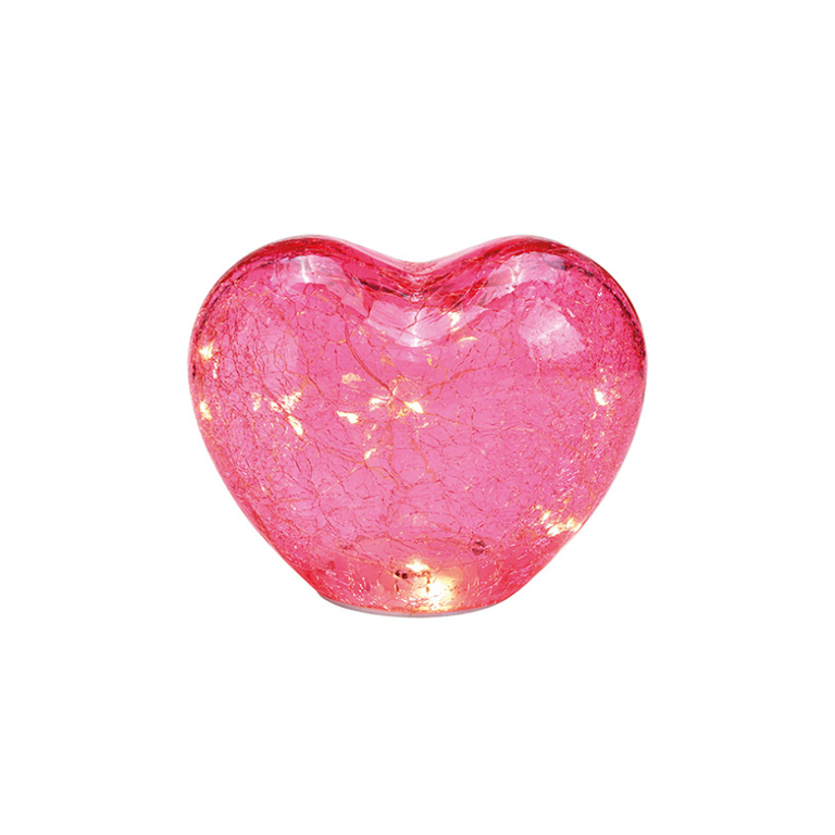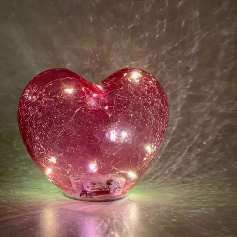 Aceasta decoratiune de interior sub forma unei inimi, este confectionata din sticla roz marmorata.Emite o lumina blanda si calda, datorita celor 10 LED-uri integrate, ce pot fi programate cu ajutorul