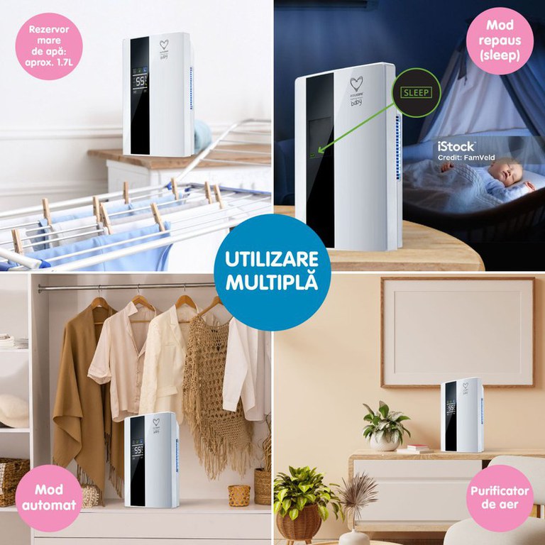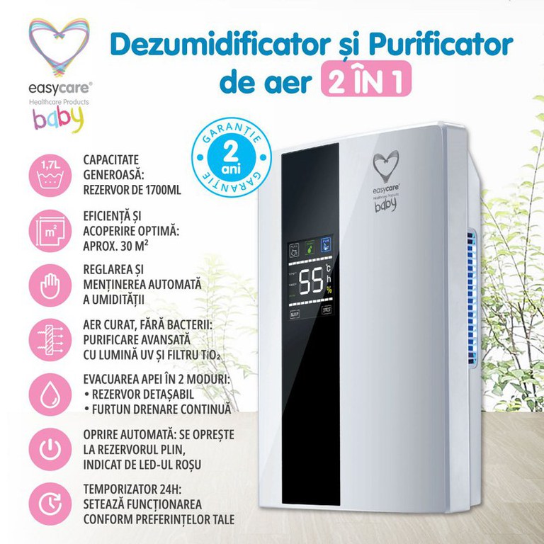 Asigur un aer curat, sntos i un nivel optim de umiditate icircn locuina ta cu EASYCARE BABY ndash Dezumidificator i Purificator de aer 2 icircn 1, conceput special pentru un mediu sigur i confortabil,