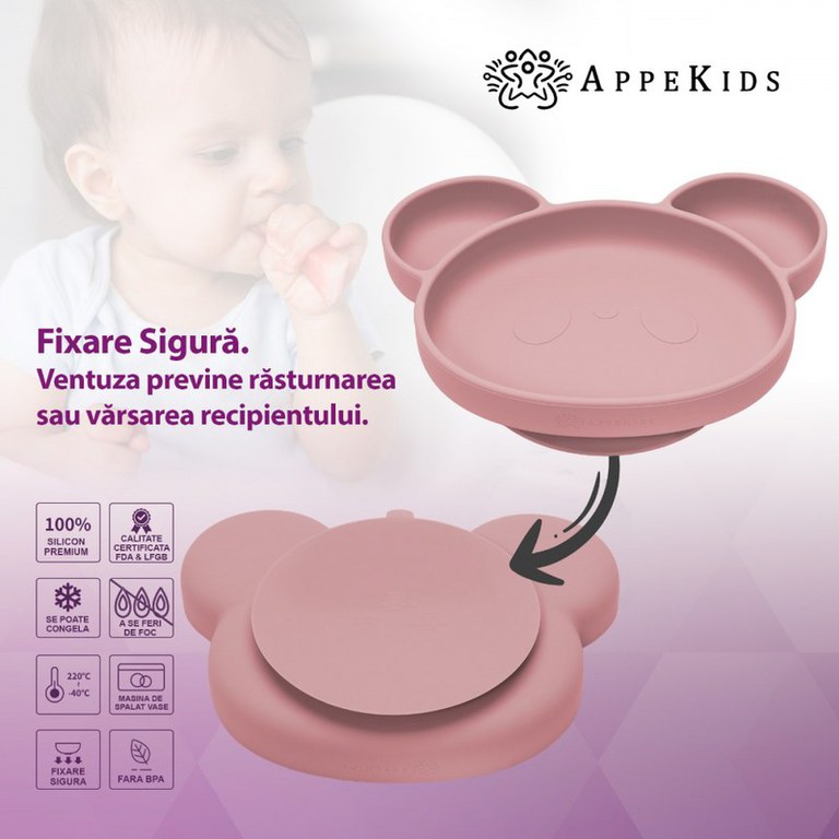 Farfurie din silicon cu ventuza AppeKids Panda Old Rose