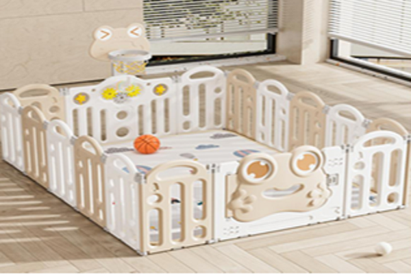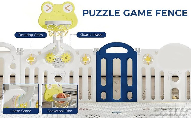 Gardulet loc de joaca pentru copii Nichiduta Garden Beige Frog, pliabil si portabil, de interiorexterior, compus din 14 panouri de gard + 2 panouri laterale cu Cos de baschet si angrenaje rotative, dimensiune 150 x 187.5cm