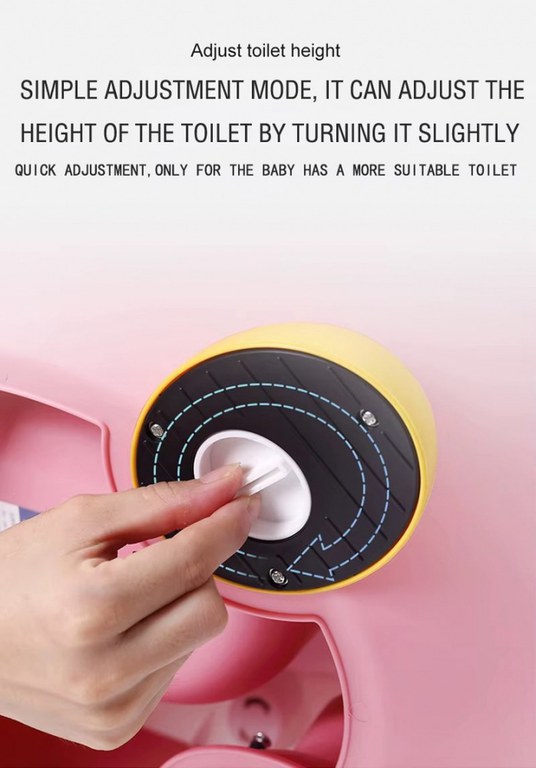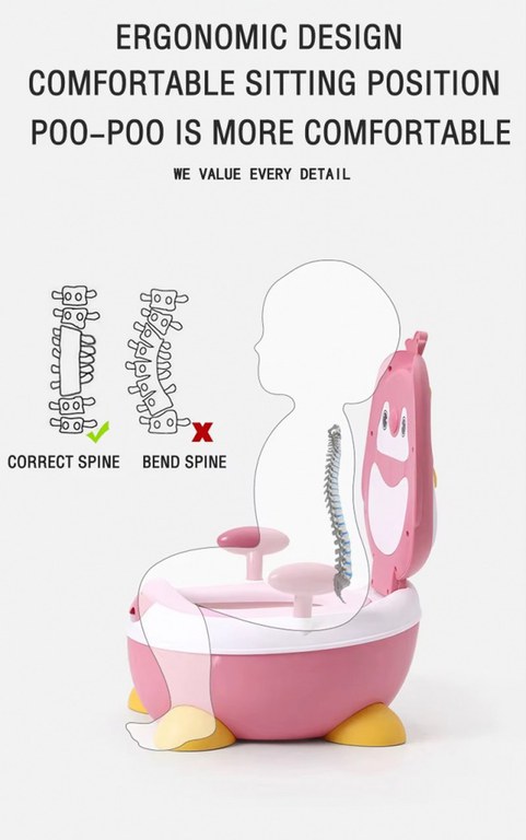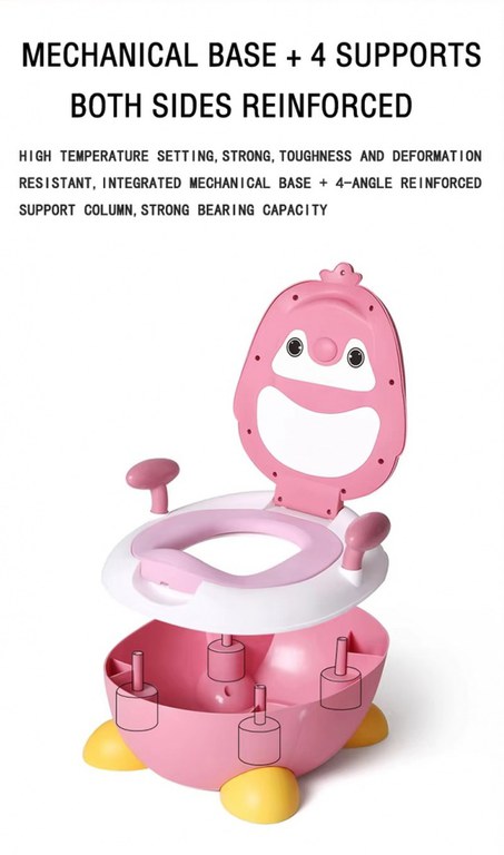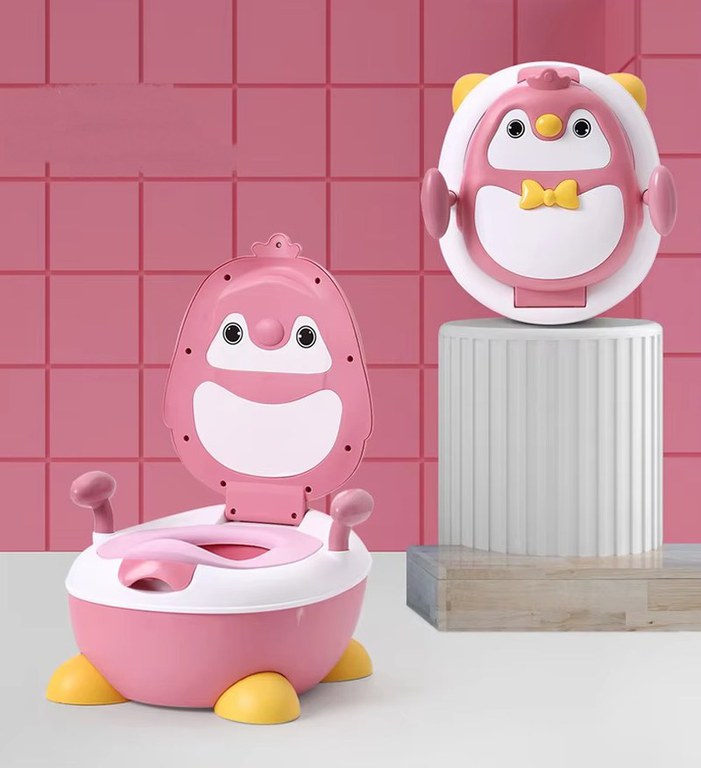 Olita pentru copii Little Mom Pink Penguin, cu picioruse antiderapante ajustabile in inaltime, capac rabatabil cu functie de spatar ergonomic, cu manere de sustinere si vas colector detasabil, dimensiune 34 x 38 x 49 cm