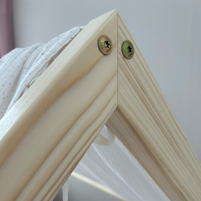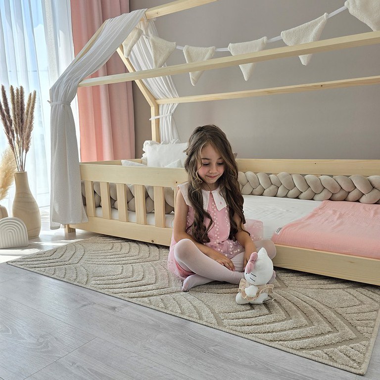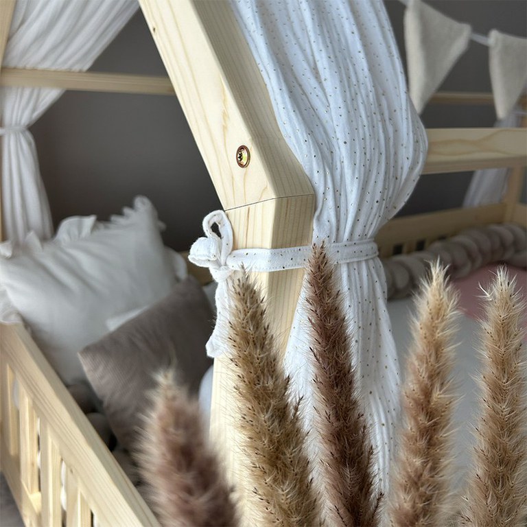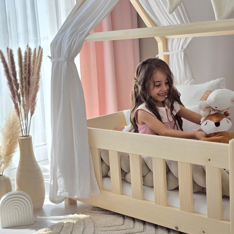 Pat copii montessori tip casuta, LittleAmy, Angel Nest, Balustrade cu bare plate, Natur, 100 x 200 cm