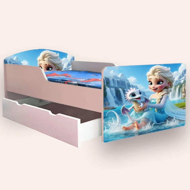 Pat pentru copii Elsa si dragonul, cu sertar si saltea, 2-8 ani, 140x70 cm