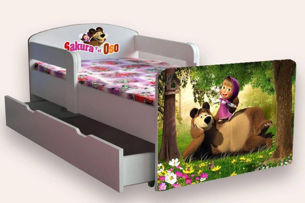 Pat pentru copii Masha si ursul, cu manere si sertar, 2-8 ani, 140x70 cm