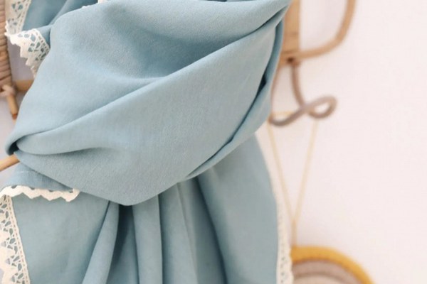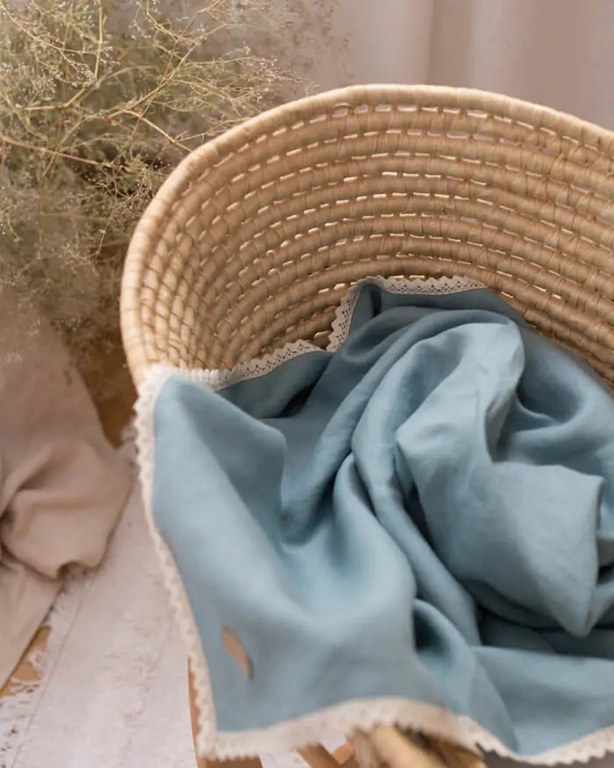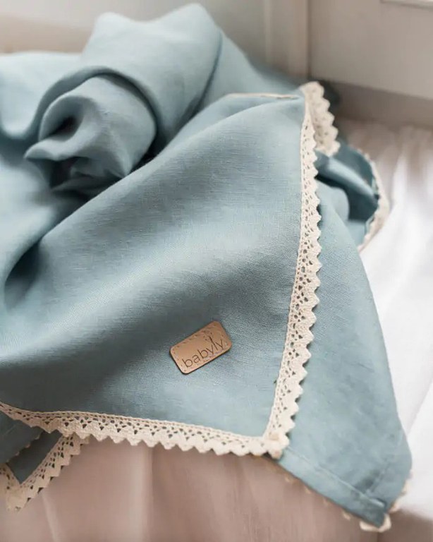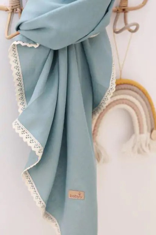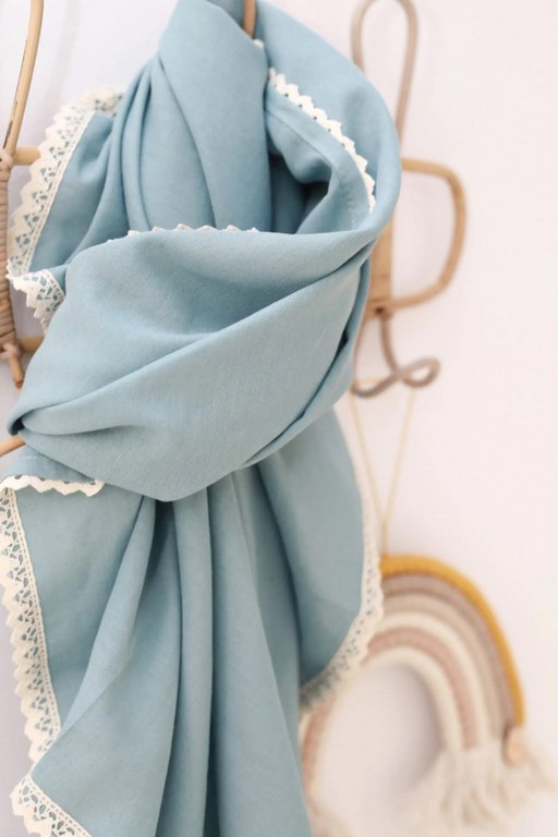 Paturica BabyLy usoara pentru copii multifunctionala din in cu margini din dantela culoarea marii 100x100cm