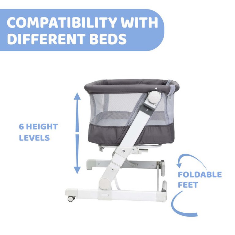 Patut atasabil Chicco Next2Me PopUp Atmoshpere gri cu picioare pliabile, laterala culisanta, reglabil pe inaltime, geanta de transport, husa detasabila si lavabila