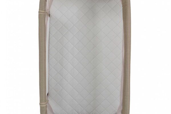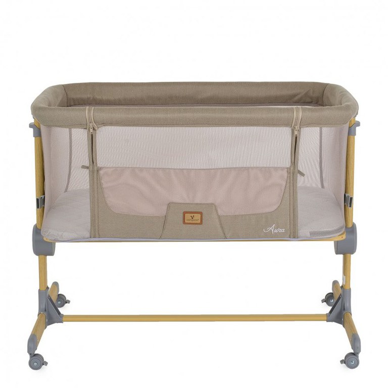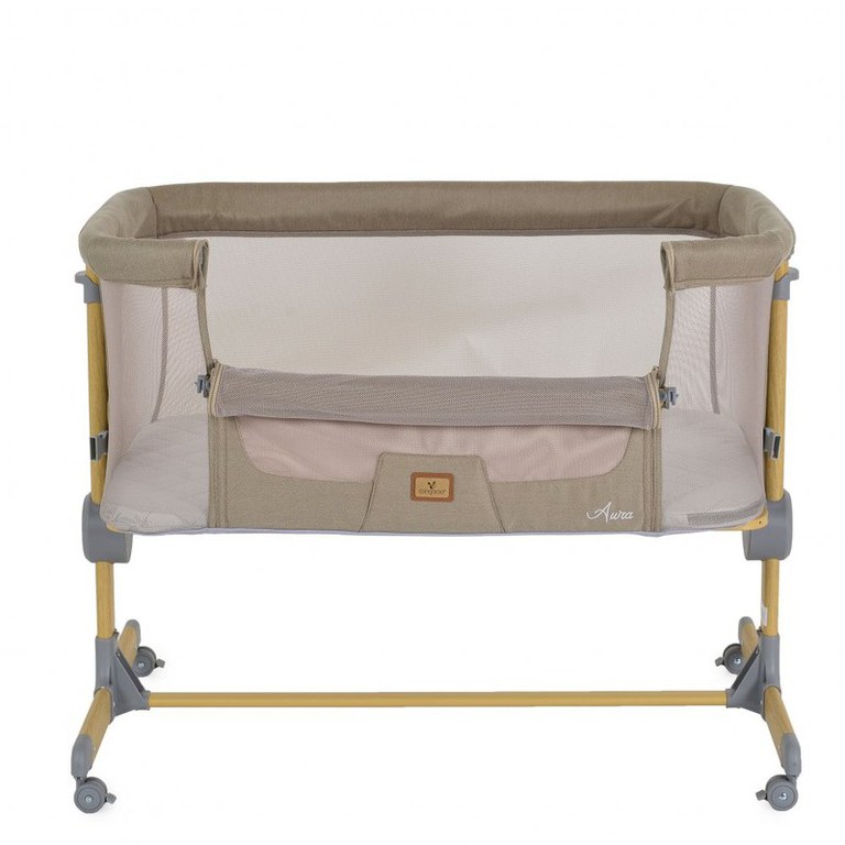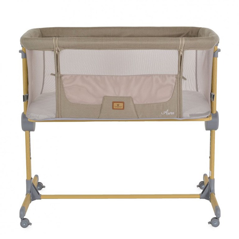 Patut Co-Sleeper Cangaroo Aura Beige 88x56 cm cu laterala culisanta, saltea cu baza ferma si husa detasabila, functie anti reflux, 7 nivele de reglare a inaltimii, 4 roti cu frana,recomandat de la nastere pana la 9 kg