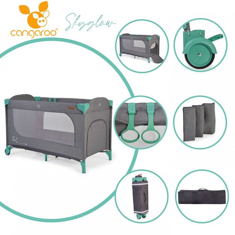Patutul pliabil Skyglow cu un nivel este potrivit pentru somn si joaca pentru copiii de pana la 14 kg.nbsp Setul include geanta pentru depozitare si transport, saltea cu grosimea de 1,5 cm si 2 inele