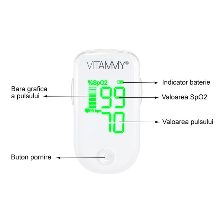Pulsoximetru Vitammy O2 afisaj LED usor de citit masoara saturatia SpO2 si pulsul alb