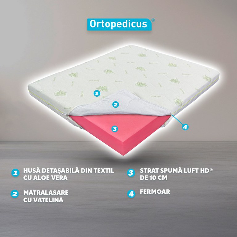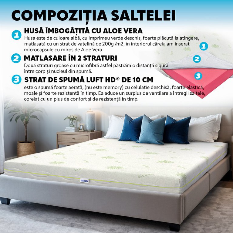 Saltea de Pat Super Ortopedica Aloe Vera Fit, 12 cm, cu spuma poliuretanica, fara arcuri, 110times190Se intampla adesea sa fim plecati de acasa si sa tanjim dupa confortul patului nostru confortabil.F
