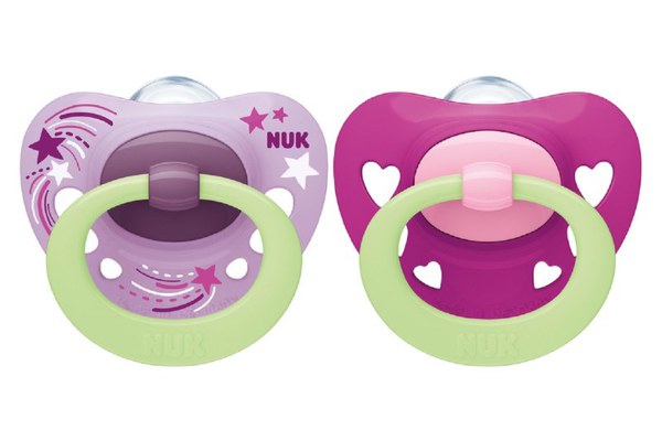 Suzeta Nuk Signature Night Silicon 0-6 luni M1 Mov, Set 2 Bucati - cu efect de stralucire in intuneric.Datorita unui material ce lumineaza, sigur pentru copii, suzetele stralucesc discret in intuneric