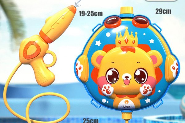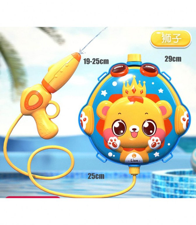 Rucsac rezervor de apa pentru copii cu aspect de leu vesel, complet cu pistol, potrivit pentru mari aventuri la mare, la piscina si chiar in parc. Este extrem de distractiv sa te joci cu ei Doar umple