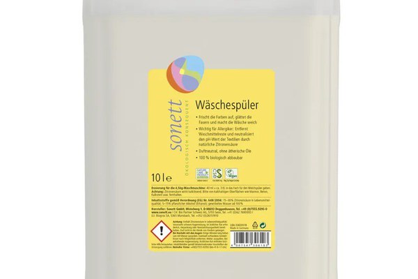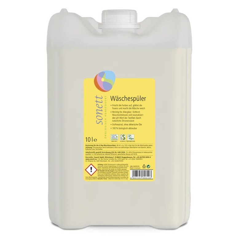 Solutie pentru clatirea rufelor ecologica 10l SonettSolutie ecologica potrivita pentru toate tipurile de rufe, ajuta la indepartarea urmelor de detergent, improspateaza culorile rufelor, lasandu-le ma