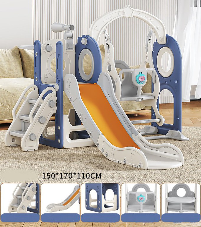 Spatiu de joaca pentru copii Nichiduta Garden bluewhite, de interiorexterior, Leagan muzical cu masuta, tobogan, treptele de acces, balustrade laterale de sustinere, 150 x 170 x 110 cm
