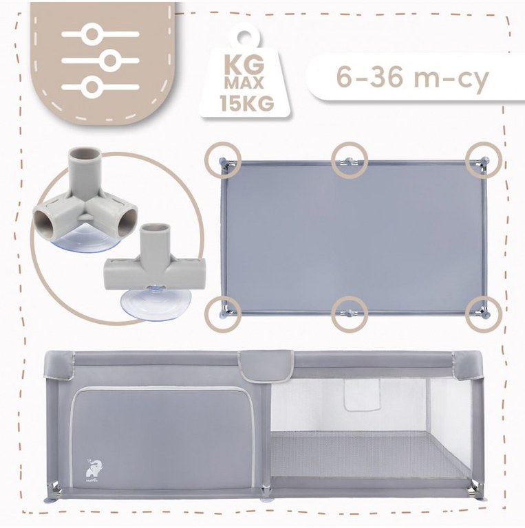 Tarc de joaca pentru copii MalPlay Kivo Grey, design modern si sigur, acces mare cu fermoar actionat din exterior, dimensiune 120 x 180 cm, cu buzunar din plasa