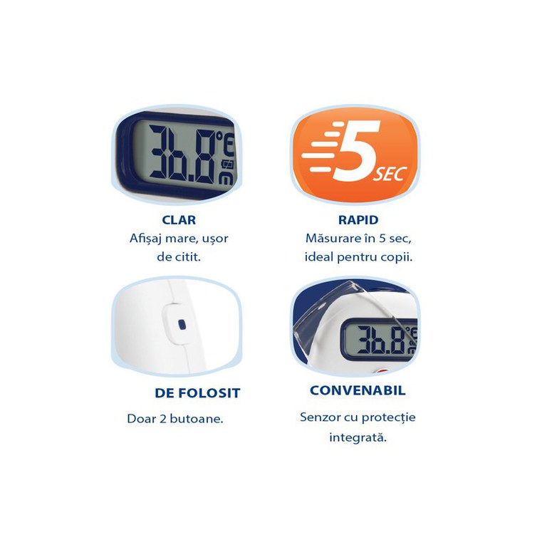 Termometru cu infrarosu cu contact Thermo Easy pentru masurarea temperaturii corporale la bebelusi, copii si adulti. ThermoEasy este un termometru digital cu raze infrarosii pentru frunte si temperatu