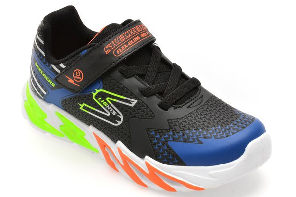 Pantofi sport SKECHERS negri, FLEX-GLOW BOLT, din material textil , Pentru: Baieti , Brand: Skechers , culoare: Negru , Material exterior: Material textil , Material talpa: Cauciuc termoplastic , Tip inchidere: Velcro . Livrare gratuita pentru comenzile de peste 299 RON acasa si in locker. Retur gratuit de acasa sau in locker.