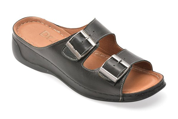 Papuci DR FIT negri, EV2860, din piele naturala , Pentru: Femei , Brand: DR FIT , culoare: Negru , Material exterior: Piele naturala , Material talpa: Cauciuc termoplastic , Tip inchidere: Slip-on . Livrare gratuita pentru comenzile de peste 299 RON acasa si in locker. Retur gratuit de acasa sau in locker.