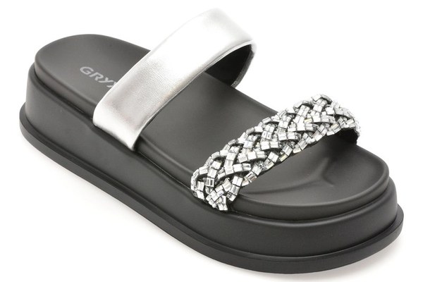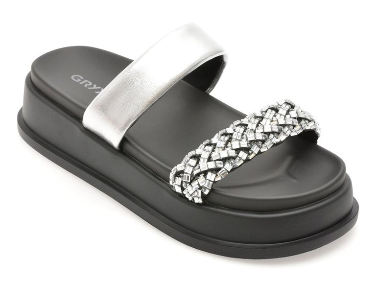 Papuci GRYXX argintii, 790, din piele ecologica , Pentru: Femei , Brand: Gryxx , culoare: Argintiu , Material exterior: Piele ecologica , Material talpa: Cauciuc termoplastic , Tip inchidere: Slip-on . Livrare gratuita pentru comenzile de peste 299 RON acasa si in locker. Retur gratuit de acasa sau in locker.