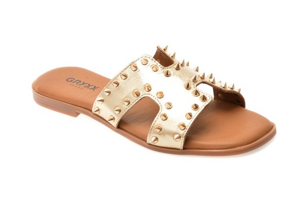 Papuci GRYXX aurii, 231360, din piele naturala , Pentru: Femei , Brand: Gryxx , culoare: Auriu , Material exterior: Piele naturala , Material talpa: pvc , Tip inchidere: Slip-on . Livrare gratuita pentru comenzile de peste 299 RON acasa si in locker. Retur gratuit de acasa sau in locker.