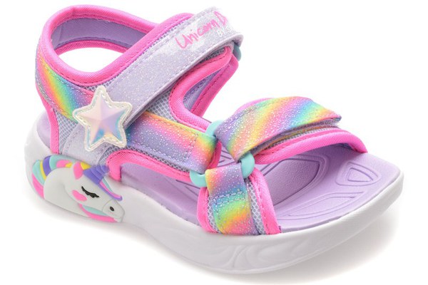 Sandale SKECHERS mov, UNICORN DREAMS SANDAL, din material textil , Pentru: Fetite , Brand: Skechers , culoare: Mov , Material exterior: Material textil , Material talpa: Cauciuc termoplastic , Tip inchidere: Velcro . Livrare gratuita pentru comenzile de peste 299 RON acasa si in locker. Retur gratuit de acasa sau in locker.