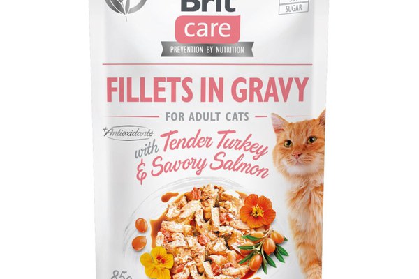 BRIT Care Fillets In Gravy, Curcan și Somon, plic hrană umedă fără cereale pisici, (în sos), 85g